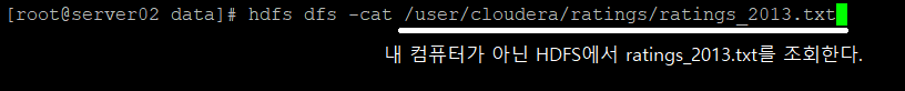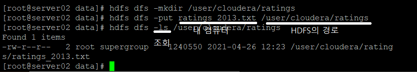 내 컴퓨터의 위치한 ratings_2013.txt를 HDFS의 경로에 옮겨준다. 옮긴 후 -ls를 통해서 저장된 리스트를 조회한다.