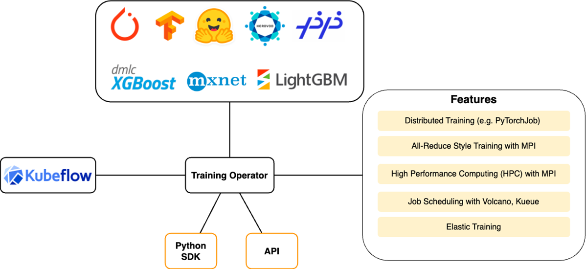 이번에는 training operator에 대해서 살펴볼려고 합니다. PyTorch, TensorFlow, XGBoost 등 다양한 ML 프레임워크를 사용하여 만든 모델의 미세 조정 및 분산 학습을 위한 Kubernetes 기반 프로젝트입니다. 그림과 같이 HuggingFace, DeepSpeed와 같은 다른 ML 라이브러리를 Training Operator와 통합하여 Kubernetes에서 ML 학습이 가능합니다. Training Operator Python SDK, API를 이용해서 구성이 가능합니다. PyTorchJob, TensorFlowJob을 이용해서 학습이 가능하고 Job 스케쥴링도 진행할 수 있습니다.