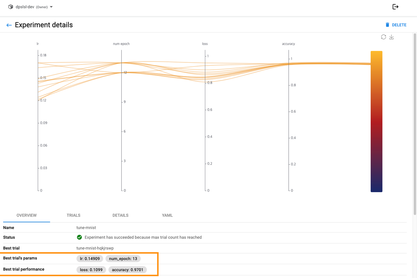 HyperParameter Tuning을 돌린 값을 대시보드로 확인한 결과입니다. 밑에 주황색 박스를 보시면 Best trial's params, Best trial performance가 있습니다. Best trial's params는 지정한 최적화할 파라미터의 최적의 값을 의미하며, Best trial performace는 사용한 metrix의 값을 의미합니다. 이렇게 지정한 metrix의 값을 이용해서 최적화된 파라미터의 값을 뱉어주며, 이를 UI적으로 그래프로도 확인할 수 있습니다. 또한 최적화된 값은 클라이언트을 이용하여 값을 가져와서 다시 학습하는데 연결해서 사용할 수 있습니다.