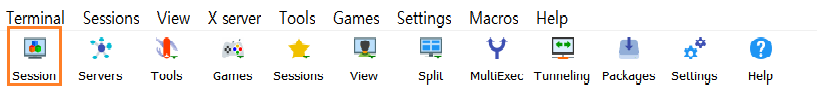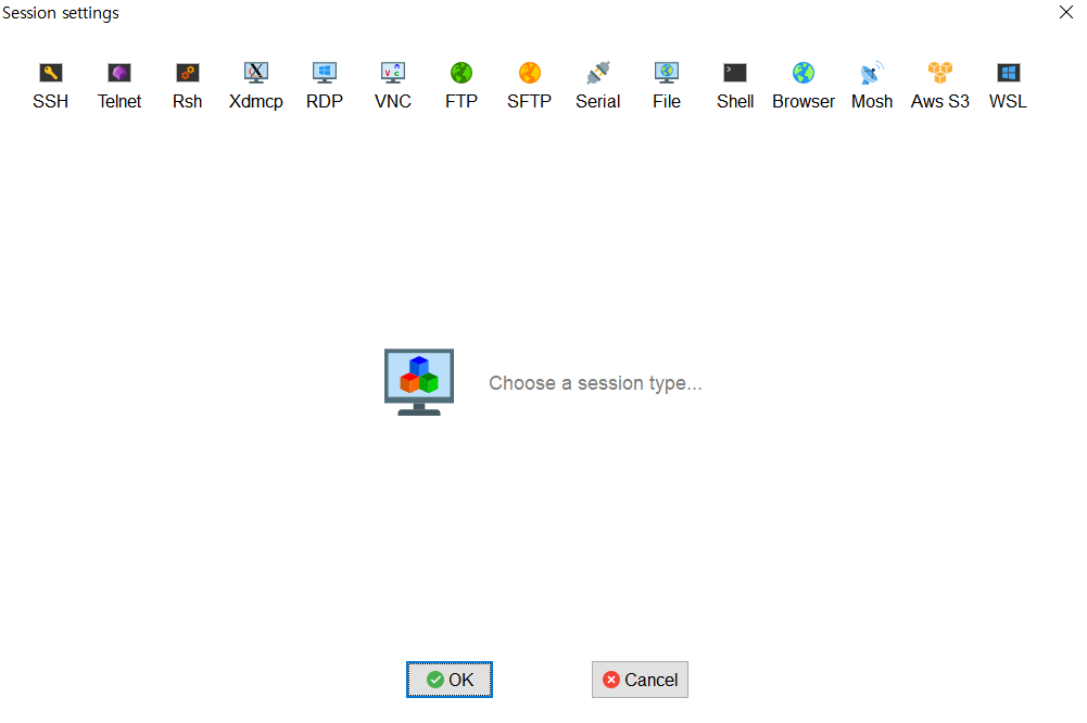 실행 후, 위에 아이콘들을 확인해보면 Session을 클릭해서 어떠한 역할을 할 수 있는지를 확인할 수 있다. MobaXterm은 VM을 연결하기위해서 사용해주는 Putty, FTP등의 역할을 할 수 있다.
